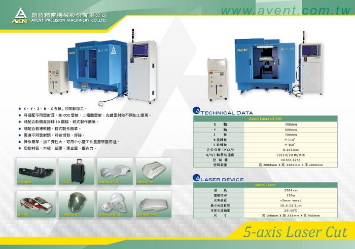 開發5-axis Laser Cut加工機 主要運用於塑膠切割遙控汽車﹑汽車內龜板﹑汽車 機車外殼﹑行旅箱﹑電動代步車外殼﹑運動器材外殼 跑步機把手外殼﹑異型工件等加工.